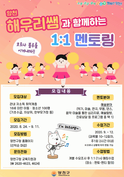 ÀÌ¿¡ ´ëÇÑ ´ëÃ¥À¸·Î ¾çõ±¸(±¸Ã»Àå ±è¼ö¿µ)¿¡¼´Â ¾çõÇõ½Å±³À°Áö±¸ »ç¾÷ ¡®Çؿ츮 ½Ü 1:1 ¸àÅ丵¡¯À» ÃßÁøÇÑ´Ù°í ¹àÇû´Ù. ÇØ¿ì¸®½Ü 1:1 ¸àÅ丵Àº ¸¶À»ÀÇ ¿¹¼úºÐ¾ß ±³ »çµéÀÌ ¾Æµ¿µéÀ» 1:1·Î ÁöµµÇÏ¿© Á¤¼Àû ¾ÈÁ¤À» ²ÒÇÏ´Â ÇÁ·Î±×·¥ÀÌ´Ù.