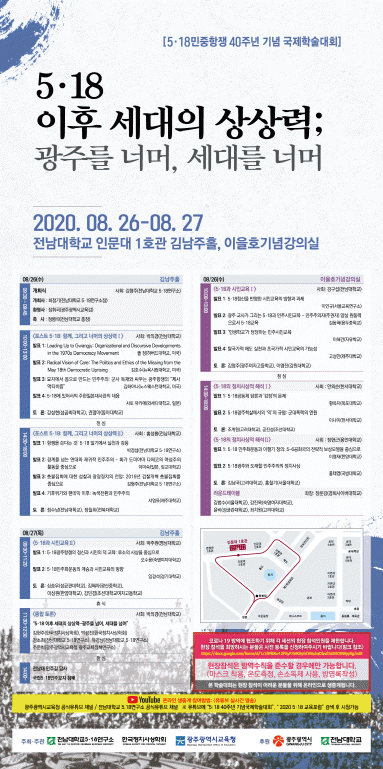 25ÀÏ ½Ã±³À°Ã»¿¡ µû¸£¸é ¡®5¡¤18 ÀÌÈÄ ¼¼´ëÀÇ »ó»ó·Â: ±¤ÁÖ¸¦ ³Ê¸Ó, ¼¼´ë¸¦ ³Ê¸Ó¡¯¸¦ ÁÖÁ¦·Î ÇÏ´Â À̹ø Çмú´ëȸ´Â 5¡¤18 ÀÌÈÄ ¼¼´ë ¿¬±¸ÀÚµéÀ» Áß½ÉÀ¸·Î ±×µéÀÇ »ó»ó·Â°ú ¿ª·®À» ¸ð¾Ò´Ù. 5¡¤18¿¡ ´ëÇÑ »õ·Î¿î Á¢±Ù°ú È®À强À» º¸¿©ÁÖ±â À§ÇØ ¡®Æ÷½ºÆ® 5¡¤18: ÇÔ²²¡¯, ¡®³Ê¸ÓÀÇ »ó»ó·Â¡¯, ¡®5¡¤18°ú ½Ã¹Î±³À°¡¯, ¡®5¡¤18ÀÇ Á¤Ä¡»ç»óÀû ÇØ¼®¡¯ ¿Ü¿¡µµ Á¾ÇÕ Åä·Ð ¶ó¿îµåÅ×À̺í±îÁö 7°³ ÇÁ·Î±×·¥ÀÌ ÁغñµÆ´Ù.