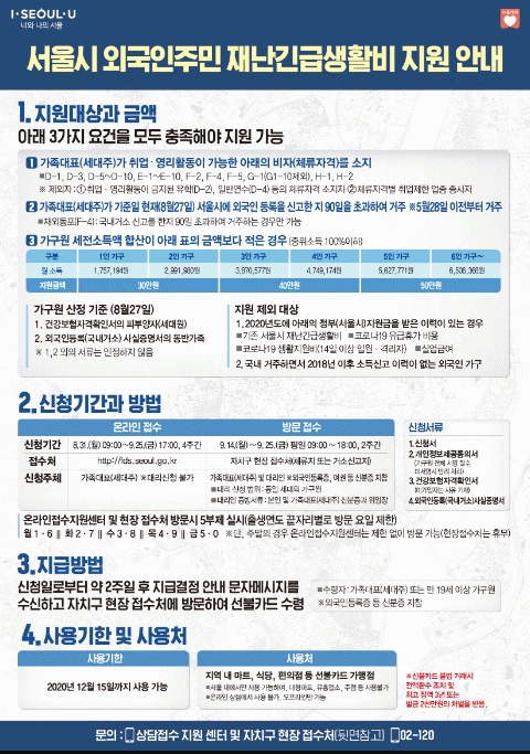 ¿Â¶óÀÎ Á¢¼ö´Â ¡®¼¿ï½Ã ¿Ü±¹ÀÎ ÁֹΠÀç³±ä±Þ»ýȰºñ Áö¿ø¡¯ ȨÆäÀÌÁö(http://fds.seoul.go.kr)¿¡¼ 8¿ù 31ÀÏ(¿ù)~9¿ù 25ÀÏ(±Ý) 4ÁÖ °£ ½ÅûÇÒ ¼ö ÀÖ´Ù. ȨÆäÀÌÁö ½ÅûÀº 24½Ã°£ °è¼Ó °¡´ÉÇÏ´Ù.