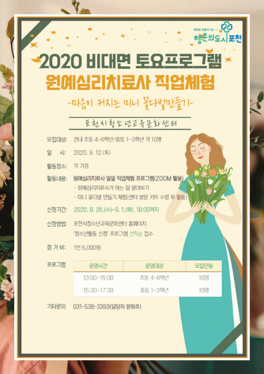 Æ÷õ½Ã °ü³» Ãʵî 4Çгâ~Áßµî 3Çгâ(11¼¼~16¼¼)À» ´ë»óÀ¸·Î 10¸í ¼±Âø¼ø ¸ðÁýÇϸç, 8¿ù 26ÀϺÎÅÍ 9¿ù 1ÀϱîÁö ȨÆäÀÌÁö(http://youth.pocheon.go.kr/)¸¦ ÅëÇØ ¿Â¶óÀÎÀ¸·Î ½ÅûÇÒ ¼ö ÀÖ´Ù.
