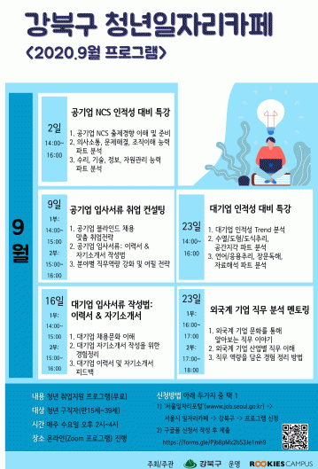 ´ë»óÀº ¸¸ 15¼¼~39¼¼ û³â ±¸Á÷ÀÚ·Î ºñ¿ëÀº ¹«·á´Ù. ±¸´Â 9¿ù 2ÀϺÎÅÍ 23ÀϱîÁö ¸ÅÁÖ ¼ö¿äÀÏ 2½Ã~4½Ã¿¡ ¿Â¶óÀÎ È»ó´ëÈ ÇÁ·Î±×·¥(Zoom)À» ÀÌ¿ëÇØ °Á¸¦ ½ÃÇàÇÒ °èȹÀÌ´Ù.