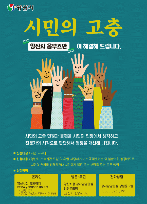 ¹Î¿ø ½Åû¹æ¹ýÀº ¾ç»ê½Ã ȨÆäÀÌÁö(¼ÒÅë.Âü¿©-°íÃæ¹Î¿ø ¿ÈºÎÁ ½Å°í¼¾ÅÍ), Á÷Á¢ ¹æ¹®(¾ç»ê½Ãû °¨»ç´ã´ç°ü½Ç û·ÅÀ±¸®ÆÀ), ¿ìÆí, ÆÑ½º(055-392-2109)·Î ½ÅûÇÏ¸é µÈ´Ù.