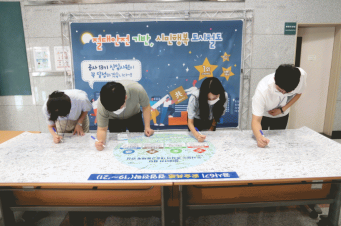 À̳¯ ±³À°½ÃÀÛ Àü ½ÅÀÔ»ç¿øµéÀº °ø»çÀÇ °æ¿µ¸ñÇ¥ÀÎ ¡°Àý´ë¾ÈÀü ±â¹Ý ½Ã¹ÎÇູ µµ½Ãöµµ ±¸Çö¡±À» ´ãÀº ´ëÇü ¼¸íÆÇ¿¡ ÀÚ½ÅÀÇ À̸§À» ¼¸íÇϸç ȸ»çÀÇ ¸ñÇ¥¸¦ °øÀ¯Çϰí, ÀÔ»ç ÈÄ ¾÷¹«¿¡ ´ëÇÑ °áÀǸ¦ ´ÙÁ³´Ù.