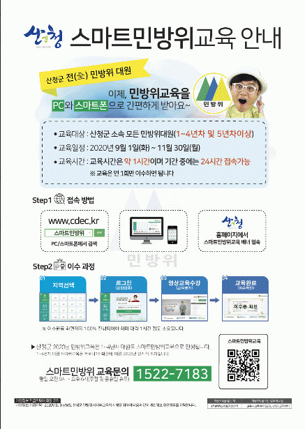»êû±º ¹Î¹æÀ§ ´ë¿øÀº 9¿ù1ÀϺÎÅÍ 11¿ù30ÀϱîÁö ½º¸¶Æ®¹Î¹æÀ§±³À° ȨÆäÀÌÁö(½º¸¶Æ®¹Î¹æÀ§±³À° www.cdec.kr)¿¡¼ º»ÀÎÀÎÁõÀ» ÅëÇØ ·Î±×ÀÎÀ» ÇÏ¸é ±³À°ÀÌ °¡´ÉÇÏ´Ù. ½º¸¶Æ®Æù°ú PC¸¦ ÅëÇØ ±³À° ¹ÞÀ» ¼ö ÀÖ°í ¿µ»ó ½Ãû ÈÄ À̼öÁõÀ» È®ÀÎÇÏ¸é µÈ´Ù.