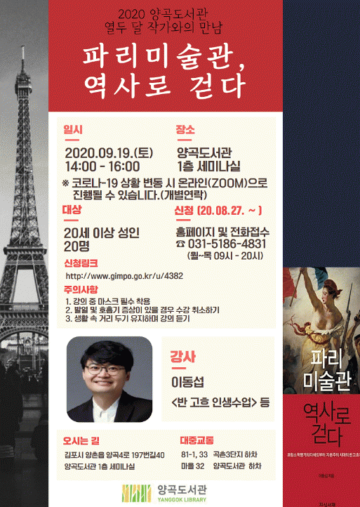 ¿¹¼ú°ú ÇÁ¶û½º ¿ª»ç¿¡ °ü½É ÀÖ´Â 20¼¼ ÀÌ»ó ¼ºÀÎÀ» ´ë»óÀ¸·Î 9¿ù 19ÀÏ 14½ÃºÎÅÍ 16½Ã±îÁö 2½Ã°£ µ¿¾È 1Ãþ ¼¼¹Ì³ª½Ç¿¡¼ ÁøÇàµÇ¸ç Äڷγª19 »óȲ¿¡ µû¶ó ¿Â¶óÀÎ(ZOOM)À¸·Î ÁøÇàµÉ ¼ö ÀÖ´Ù.