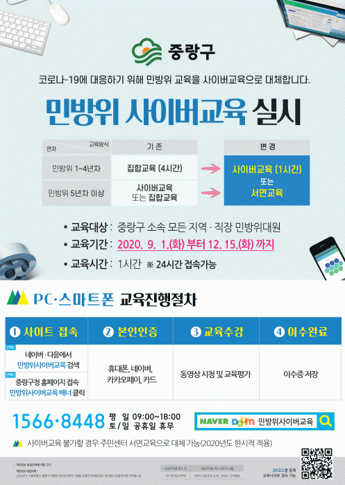 ¡®¹Î¹æÀ§ »çÀ̹ö±³À°¡¯Àº 9¿ù 1ÀϺÎÅÍ 12¿ù 15ÀϱîÁö ÁøÇàµÇ¸ç, °³ÀÎ PC ¹× ½º¸¶Æ®ÆùÀ» ÀÌ¿ëÇÏ¿© ¹Î¹æÀ§ »çÀ̹ö±³À° »çÀÌÆ®(www.cmes.or.kr)¿¡ Á¢¼Ó ÈÄ º»ÀÎÀÎÁõÀ» °ÅÃÄ 1½Ã°£ÀÇ ±³À° ¿µ»óÀ» ½ÃûÇÏ°í °´°ü½Ä Æò°¡¿¡ ÇÕ°ÝÇÏ¸é ±³À°À̼ö·Î ÀÎÁ¤µÈ´Ù.