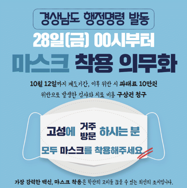 ¸¶½ºÅ© Âø¿ë Àǹ«È ÇàÁ¤¸í·ÉÀ¸·Î °í¼º °ÅÁÖÀÚ¿Í °í¼ºÀ» ¹æ¹®ÇÏ´Â »ç¶÷Àº À½½Ä¹° ¼·Ãë µî ºÒ°¡ÇÇÇÑ °æ¿ì¸¦ Á¦¿ÜÇϰí´Â ¹Ýµå½Ã ¸¶½ºÅ©¸¦ Âø¿ëÇØ¾ß Çϸç, ½Ç¿ÜÀÇ °æ¿ìµµ ¸¹Àº »ç¶÷ÀÌ ¸ðÀÎ °÷, ´Ù¸¥ »ç¶÷°úÀÇ Á¢ÃËÀÌ ÀæÀº °÷¿¡¼´Â ¸¶½ºÅ© Âø¿ëÀÌ Àǹ«ÈµÈ´Ù.