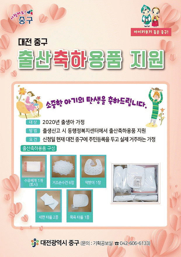 Áö¿ø´ë»óÀÚ´Â ½ÅûÀÏ ÇöÀç ´ëÀü Áß±¸¿¡ Áֹεî·ÏÀ» µÎ°í ½ÇÁ¦ °ÅÁÖÇϸç 2020.1.1. ~ 12.31 µ¿¾È Àڳฦ Ãâ»êÇÑ °¡Á¤À¸·Î ÁÖ¼ÒÁö °üÇÒ ÇàÁ¤º¹Áö¼¾ÅÍ¿¡¼ Ãâ»ý½Å°í¸¦ ÇÏ¸é ¹Ù·Î Ãâ»êÃàÇÏ¿ëǰÀ» Áö¿ø¹ÞÀ» ¼ö ÀÖ´Ù. ¶ÇÇÑ »ç¾÷½ÃÇà Àü Ãâ»ý½Å°í °¡Á¤¿¡ ´ëÇØ¼´Â Ãâ»êÃàÇÏ¿ëǰ »ç¾÷ ¾È³»¹®À» ¿ìÆí°ú ¹®ÀÚ¸Þ½ÃÁö µîÀ¸·Î ¹ß¼ÛÇÏ¿© ºüÁü¾øÀÌ ¼Ò±Þ Áö¿øÇÒ °èȹÀÌ´Ù.