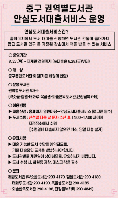 Áß±¸´Â ¾Õ¼ Áö³ 3¿ù Äڷγª19ÀÇ È®»êÀ¸·Î ÀÎÇØ µµ¼°ü ÈÞ°üÀÌ Àå±âÈ µÇÀÚ ÃÖ¼ÒÇÑÀÇ µ¶¼¹®È ¼ºñ½º¸¦ Á¦°øÇϱâ À§ÇØ ¡®¾È½Éµµ¼´ëÃ⼺ñ½º¡¯ ¿î¿µÀ» ½Ç½ÃÇÑ ¹Ù ÀÖ´Ù.