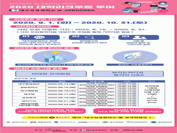 ¿Â¶óÀÎÀÌ Àͼ÷ÇÏÁö ¾ÊÀº û³â ±¸Á÷Àڵ鵵 ¡®Áö¿ª 7°³ ´ëÇÐ Ãë¾÷Áö¿øÆÀ¡¯°ú ¡®°è¸í´ëÇб³ ´ëÇÐâÁ¶ÀÏÀÚ¸®¼¾ÅÍ¡¯ µîÀÇ ÇùÁ¶¸¦ ÅëÇØ ¿øÈ°ÇÑ ¿Â¶óÀÎ Áö¿øÀ» ¹ÞÀ» ¼ö ÀÖ´Ù. Çà»ç ÀÏÁ¤, »ó´ã¿¹¾à µî ¸®Å©·çÆ® Åõ¾î¿Í °ü·ÃµÈ º¸´Ù ÀÚ¼¼ÇÑ ³»¿ëÀº ¸®Äí¸£Æ® Åõ¾î ȨÆäÀÌÁö(www.daegu-recruit.kr) ¶Ç´Â ´ë±¸»ó°øÈ¸ÀÇ¼Ò Åë»óÁøÈïÆÀ(053-222-3104)À¸·Î ¹®ÀÇÇÏ¸é µÈ´Ù.
