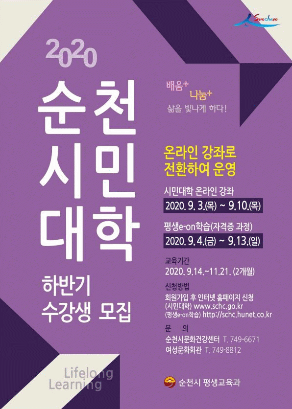¼ö°½ÅûÀº ¼øÃµ½Ã ¹®È°Ç°¼¾ÅÍ È¨ÆäÀÌÁö(schc.go.kr) ¿Í Æò»ýe-onÇнÀ ȨÆäÀÌÁö(schc.hunet.co.kr) ¸¦ ÅëÇØ ¼±Âø¼øÀ¸·Î Á¢¼öÇϸç, ±âŸ ÀÚ¼¼ÇÑ »çÇ×Àº ¼øÃµ½Ã Æò»ý±³À°°ú(749-6671)¿Í ¿©¼º¹®Èȸ°ü(749-8812)À¸·Î ¹®ÀÇÇÏ¸é µÈ´Ù.