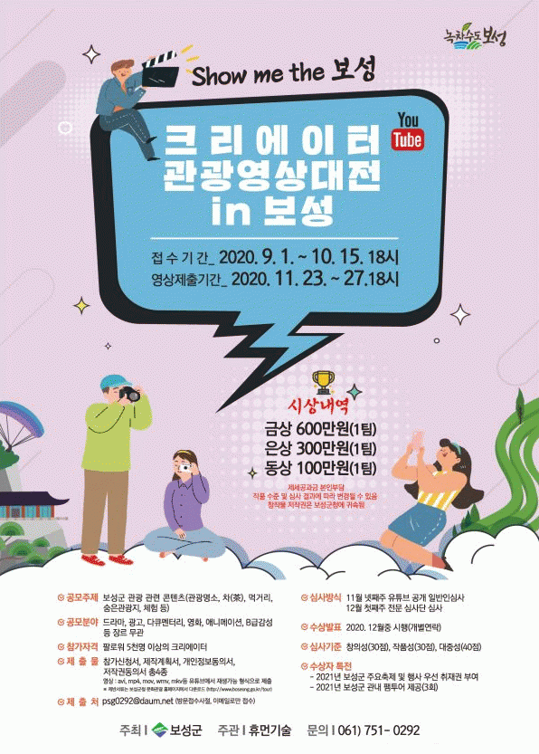 ÇÑÆí, º¸¼º±ºÀº À̹ø Å©¸®¿¡ÀÌÅÍ °ü±¤ ¿µ»ó ´ëÀü°ú ÇÔ²² Àü±¹ ´ëÇлýÀ» ´ë»óÀ¸·Î ÇÏ´Â ¾ÆÀ̵ð¾î °ü±¤ ¿µ»ó ´ëÀüÀ» ÃßÁøÇØ Áö¼ÓÀûÀÎ È«º¸ ÄÜÅÙÃ÷ ¹ß±¼¿¡ ³ª¼³ °èȹÀÌ´Ù. °ü±¤ ¿µ»ó ´ëÀü¿¡ ´ëÇÑ ÀÚ¼¼ÇÑ Á¤º¸´Â º¸¼º±º º¸¼º¹®È°ü±¤ ȨÆäÀÌÁö(www.boseong.go.kr/tour)¿¡¼ È®ÀÎÇÒ ¼ö ÀÖ´Ù.