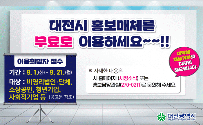 ÇÑÆí, È«º¸¸Åü ½Ã¹ÎÀÌ¿ë»ç¾÷Àº ´ëÀü½Ã¿¡¼ 2016³âºÎÅÍ ½ÃÇàÇØ ÇöÀç±îÁö 118°³ ¾÷ü¸¦ ¼±Á¤, ¹«·á±¤°í¸¦ Áö¿øÇØ ÀÌ¿ë´ë»óÀÚµé·ÎºÎÅÍ Å« È£ÀÀÀ» ¾ò°í ÀÖ´Ù.