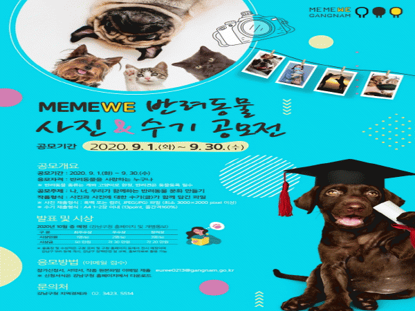 ¹Ý·Áµ¿¹°Àº °³¿Í °í¾çÀÌ¿¡ ÇÑÇϸç, ´©±¸³ª Âü¿© °¡´ÉÇÏ´Ù. °³Àκ° ÃÖ´ë 3°³ ÀÛǰ±îÁö Ãâǰ °¡´ÉÇϸç, °³²±¸Ã» ȨÆäÀÌÁö¿¡¼ ¾ç½ÄÀ» ´Ù¿î¹Þ¾Æ ÀÌ´Þ 30ÀϱîÁö ´ã´çÀÚ À̸ÞÀÏ(euree0213@gangnam.go.kr)·Î Âü°¡½Åû¼¿Í ÀÀ¸ðÀÛ ÆÄÀÏÀ» Á¦ÃâÇÏ¸é µÈ´Ù.