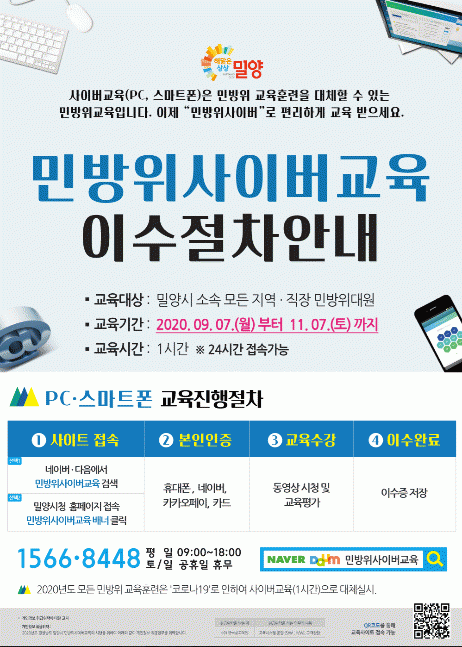 »çÀ̹ö ±³À° ¼ö°¹æ¹ýÀº ÄÄÇ»Åͳª ½º¸¶Æ®ÆùÀ¸·Î ÀÎÅÍ³Ý Æ÷ÅÐ ¶Ç´Â ¹Ð¾ç½Ã ȨÆäÀÌÁö¸¦ ÅëÇØ ¡°¹Î¹æÀ§ »çÀ̹ö±³À°¼¾ÅÍ(http://www.cmes.or.kr)¡±¿¡ Á¢¼ÓÇØ ¹Î¹æÀ§ »çÀ̹ö±³À° 1½Ã°£ ¼ö° ÈÄ °ú¸ñº° Æò°¡¹®Á¦¸¦ Ç®¾î Æò°¡Á¡¼ö 70Á¡ ÀÌ»óÀÌ µÇ¸é ±³À°À̼ö 󸮵ȴÙ.