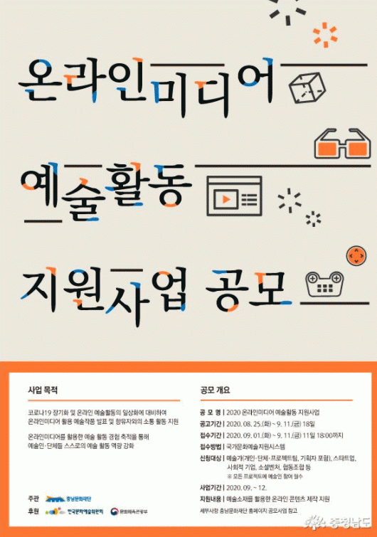 À̹ø »ç¾÷Àº ¹Ìµð¾î¸¦ Ȱ¿ëÇØ ¿¹¼ú ÀÛǰÀ» ¹ßÇ¥Çϰųª ¿Â¶óÀÎÀ» ÅëÇØ ¹®ÈÇâÀ¯ÀÚµé°úÀÇ ¼ÒÅë Ȱµ¿¿¡ ´ëÇÑ Áö¿ø, ¿¹¼ú°¡µéÀÇ ¼öÀÍȰµ¿ÀÌ °¡´ÉÇÑ Ç÷§Æû ±¸Ãà µîÀ» Áö¿øÇÑ´Ù. Áö¿ø´ë»óÀº Ãæ³²¿¡ ¼ÒÀçÇÑ ¿¹¼ú´Üü ¹× °³ÀÎÀÌ¸ç ¿¹¼úÀÎÀÌ Âü¿©ÇÏ´Â ÇÁ·Î±×·¥À̸é ÇÁ·ÎÁ§Æ®ÆÀ, »çȸÀûÇùµ¿Á¶ÇÕ µîµµ Áö¿ø °¡´ÉÇÏ´Ù.