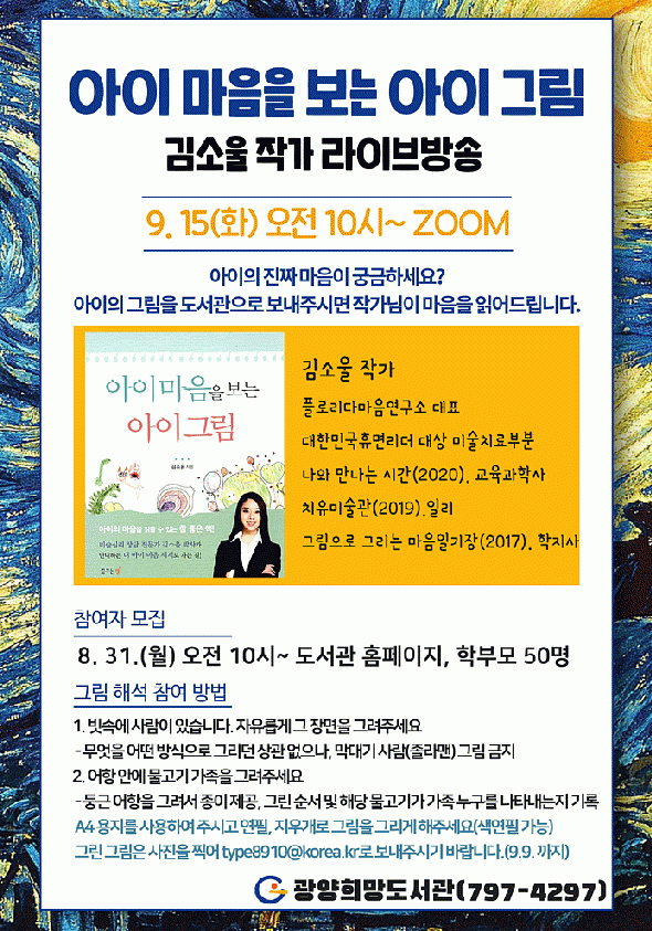 ÇÑÆí, ¡®¾ÆÀÌ ¸¶À½À» º¸´Â ¾ÆÀÌ ±×¸²¡¯ ù ¹øÂ° °¿¬Àº Áö³ 8¿ù 31ÀÏ ¿ÀÀü 10½ÃºÎÅÍ Çкθð 50¸íÀ» ¸ðÁýÇϰí ÀÖÀ¸¸ç, ¡®À̱ÔÂù À¥Å÷ÀÛ°¡¿ÍÀÇ ¸¸³²¡¯Àº ¿À´Â 9¿ù 8ÀÏ ¿ÀÀü 10½ÃºÎÅÍ ±¤¾ç½Ã¸³µµ¼°ü ȨÆäÀÌÁö(https://lib.gwangyang.go.kr/)¸¦ ÅëÇØ ¼±Âø¼ø ¸ðÁýÇÑ´Ù.