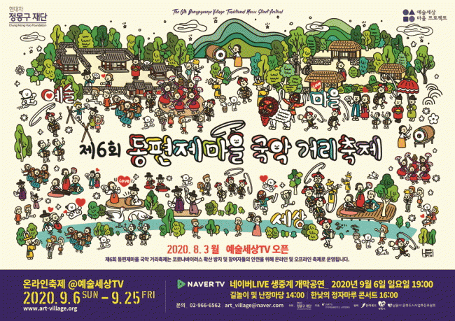 Çö´ëÂ÷ Á¤¸ù±¸ Àç´Ü(ÀÌ»çÀå ±Ç¿À±Ô)ÀÌ ÁÖÃÖÇϰí Çѱ¹¿¹¼úÁ¾ÇÕÇб³(ÃÑÀå ±èºÀ·Ä)ÀÌ ÁÖ°ü, ³²¿ø½Ã¿Í Àü¶óºÏµµ°¡ 6³â° ÈÄ¿øÇϰí ÀÖ´Â ¡®Á¦6ȸ µ¿ÆíÁ¦¸¶À» ±¹¾Ç °Å¸®ÃàÁ¦¡¯°¡ ¿À´Â 9¿ù 6ÀϺÎÅÍ 25ÀϱîÁö 20ÀÏ µ¿¾È ¿Â¶óÀÎÀ¸·Î °³ÃֵDZ⠶§¹®. ¿©¼¸ µ¹À» ¸ÂÀÌÇÑ ¡®µ¿ÆíÁ¦¸¶À» ±¹¾Ç °Å¸®ÃàÁ¦¡¯´Â ±×µ¿¾È µ¿ÆíÁ¦ ÅÈÀÚ¸® ÀÎ ¿îºÀ ºñÀü¸¶À»¿¡¼ ¸¹Àº °ü±¤°´°ú ½Ã¹ÎÀÌ ÇÔ²² ¾î¿ì·¯Á® 2¹Ú 3ÀÏ µ¿¾È ÁøÇàµÆÁö¸¸, ¿ÃÇØ´Â ½ÅÁ¾ Äڷγª¹ÙÀÌ·¯½º °¨¿°Áõ(COVID-19)¿¡ µû¸¥ È®»ê ¹æÁö¸¦ À§ÇØ ºÎµæÀÌ ¿Â¶óÀÎÀ¸·Î °³ÃÖ, ¿î¿µÇÒ °èȹÀÌ´Ù.