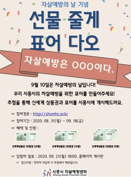 ÀÌ¿¡ ½ÃÈï½Ã´Â ¿À´Â 9¿ù30ÀϱîÁö Àڻ쿹¹æÀÇ ³¯À» Ȱ¹ßÈ÷ È«º¸ÇÒ °èȹÀÌ´Ù. °ü³»ÀÇ ÇàÁ¤¿ë °Ô½Ã´ë¸¦ ÀÌ¿ëÇØ ½Ã¹Îµé¿¡°Ô Èñ¸ÁÀÇ ¸Þ½ÃÁö¸¦ Àü´ÞÇϰí, ¡®9¿ù 10ÀÏ Àڻ쿹¹æÀÇ ³¯¡¯À» ¾Ë¸°´Ù. ¶ÇÇÑ ½ÃÈï½ÃÁ¤½Å°Ç°º¹Áö¼¾ÅÍ¡¤Àڻ쿹¹æ¼¾ÅÍ È¨ÆäÀÌÁö¿Í SNS¿¡¼´Â Àڻ쿹¹æ Ç¥¾î À̺¥Æ®µµ µ¿½Ã¿¡ ÁøÇàÇÑ´Ù.