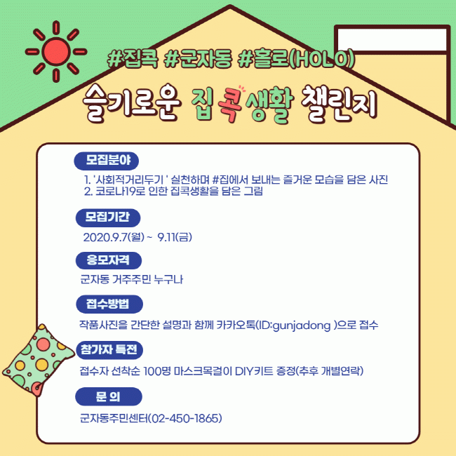 À̹ø 縰Áö´Â ±ºÀÚµ¿¿¡ °ÅÁÖÇÏ´Â ÁÖ¹ÎÀ» ´ë»óÀ¸·Î ÁøÇàµÇ¸ç, ¡®»çȸÀû°Å¸®µÎ±â¸¦ ½ÇõÇϸç Áý¿¡¼ º¸³»´Â Áñ°Å¿î ¸ð½À¡¯À» ´ãÀº »çÁøÀ̳ª ¡®Äڷγª19 ±Øº¹À» À§ÇÑ ½½±â·Î¿î ÁýÄÛ»ýȰ¡¯À» ÁÖÁ¦·Î ÇÑ ±×¸²À» īī¿ÀÅå ¶Ç´Â À̸ÞÀÏ·Î Á¦ÃâÇÏ¸é µÈ´Ù. Âü°¡ÀÚ Áß ¼±Âø¼ø 100¸í¿¡°Ô´Â ¸¶½ºÅ© ¸ñ°ÉÀÌ DIYŰƮ¸¦ ÁõÁ¤ÇÒ ¿¹Á¤ÀÌ´Ù.