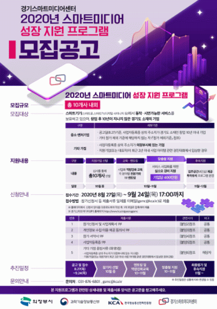 ÇÑÆí, ¡®2020³â ½º¸¶Æ®¹Ìµð¾î ¼ºÀå Áö¿ø ÇÁ·Î±×·¥¡¯¿¡ Âü°¡¸¦ Èñ¸ÁÇÏ´Â ±â¾÷Àº 9¿ù 24ÀϱîÁö Âü°¡½Åû¼ µîÀÇ Á¦Ãâ¼·ùµéÀ» À̸ÞÀÏ(gsmc@kca.kr)·Î Á¦ÃâÇÏ¿©¾ß Çϸç, °ø¸ðÀü°ú °ü·ÃÇÑ ÀÚ¼¼ÇÑ ³»¿ëÀº °æ±â½º¸¶Æ®¹Ìµð¾î¼¾ÅÍ È¨ÆäÀÌÁö(https://www.kca.kr/gyeonggismc/)¸¦ ÅëÇØ È®ÀÎÇÒ ¼ö ÀÖ´Ù.