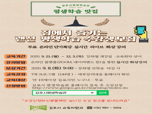 Àü °Á ¹«·á·Î ¿î¿µµÇ´Â À̹ø ´Ü±âƯ° ¼ö°Àº Æò»ýÇнÀ°ü ȨÆäÀÌÁö(http://www.gimpo.go.kr/learning/index.do)¸¦ ÅëÇØ 9¿ù 8ÀϺÎÅÍ Á¢¼ö °¡´ÉÇÏ¸ç ¼ö°½ÅûÀÌ ¿Ï·áµÈ ½Ã¹Î¿¡ ÇÑÇØ °ÀÇ½Ç ÀÔÀå ¸µÅ©¸¦ ¹ß¼Û ÇÒ ¿¹Á¤ÀÌ´Ù.