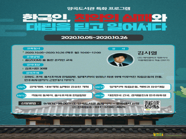 10¿ù 5ÀϺÎÅÍ 26ÀϱîÁö 10½ÃºÎÅÍ 2½Ã°£ µ¿¾È È»ó ZOOMÀ» ÅëÇØ ÁøÇàµÇ¸ç, 9¿ù 8ÀϺÎÅÍ ¼±Âø¼ø 30¸íÀ» ¾ç°îµµ¼°ü ȨÆäÀÌÁö ¹× Àüȸ¦ ÅëÇÑ Á¢¼ö·Î ¹Þ´Â´Ù.