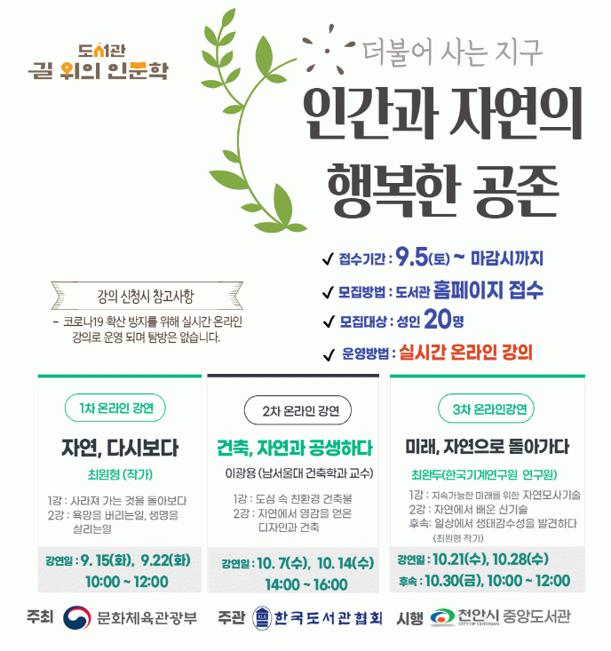 À̹ø ÇÁ·Î±×·¥Àº ÀÚ¿¬ÀÇ À§ÇùÀÌ Àΰ£ÀÇ Æò¹üÇÑ ÀÏ»óÀ» À§ÅÂ·Ó°Ô Çϰí ÀÖ´Â ¿äÁòÀÇ »óȲ¿¡¼ Àΰ£ÀÌ ÀÚ¿¬°ú ÈÇØÇÏ°í °øÁ¸ÇÒ ¼ö ÀÖ´Â ¡®Áö¼Ó°¡´ÉÇÑ ¹Ì·¡¡¯¿¡ ´ëÇÑ °í¹ÎÀ» ÇÔ²² ³ª´©¾îº¸°íÀÚ ±âȹµÆ´Ù.