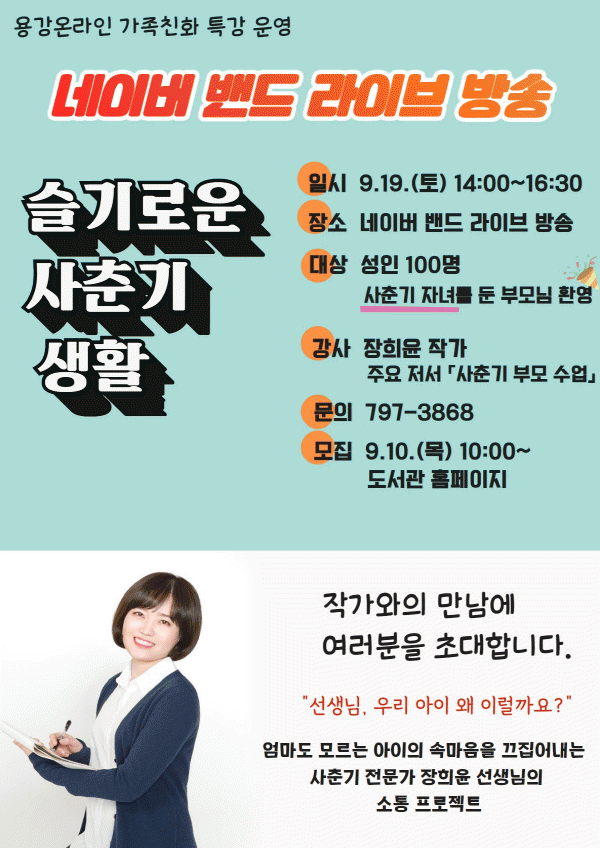 À̹ø Ư°Àº 9¿ù 10ÀÏ ¸ñ¿äÀÏ ¿ÀÀü 10½ÃºÎÅÍ µµ¼°ü ȨÆäÀÌÁö(http://lib.gwangyang.go.kr)¿¡¼ ½Åû °¡´ÉÇϸç, ½ÅûÀÚ¿¡°Ô´Â °Á¸¦ µéÀ» ¼ö ÀÖ´Â ¸µÅ©¸¦ ¹®ÀÚ·Î Àü¼ÛÇÒ ¿¹Á¤ÀÌ´Ù. ÀÚ¼¼ÇÑ »çÇ×Àº ¿ë°µµ¼°ü(¢Ï061-797-3868)À¸·Î ¹®ÀÇÇÏ¸é µÈ´Ù.