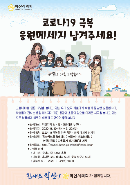 ÀÍ»êÁö¿ª ÃÊ?Áß?°íµîÇлýÀº ´©±¸³ª Âü¿© °¡´ÉÇϸç ÀÍ»ê½ÃÀÇȸ ȨÆäÀÌÁö ¾î¸°À̱¤Àå ¡®ÀÚÀ¯·Ó°Ô ¾ê±âÇØ¿ä¡¯¿¡ ¸Þ½ÃÁö¸¦ ³²±â¸é Âü¿© Çлý Áß 100¸íÀ» Ãß÷ÇÏ¿© ¼ÒÁ¤ÀÇ ±â³äǰÀ» ÁõÁ¤ÇÒ ¿¹Á¤ÀÌ´Ù.