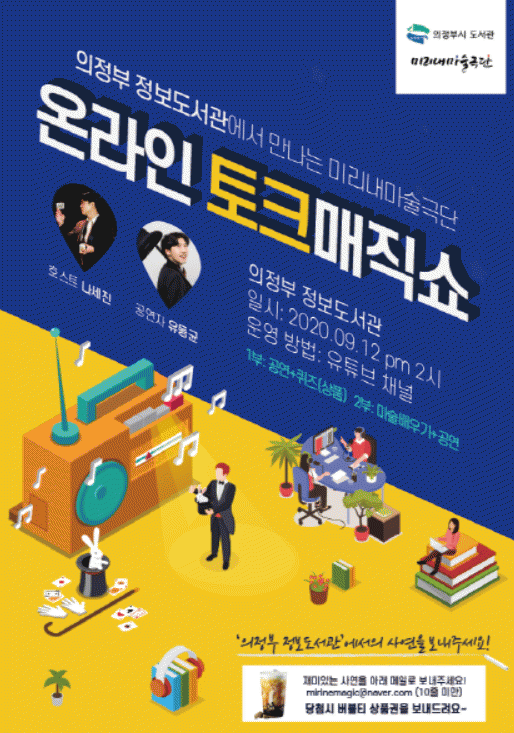 ºñ´ë¸é °ø¿¬À¸·Î ÁøÇàµÇ´Â À̹ø ¸¶¼ú¼î´Â Äڷγª-19 »çȸÀû °Å¸®µÎ±â 2.5´Ü°è·Î ÀÎÇØ °¡Á¤¿¡¼ ¿ÜÃâÀ» ÀÚÁ¦Çϰí ÀÖ´Â ½Ã±â¿¡ °¡Á·µé°ú ÇÔ²² ¿µ»óÀ» ÅëÇÏ¿© ¸¶¼ú °ø¿¬À» °ü¶÷Çϰí ÄûÁ Ç®¾îº¸¸ç, Áý¿¡ ÀÖ´Â »ýȰ µµ±¸·Î °£´ÜÇÑ ¸¶¼úÀ» ¹è¿öº¸´Â ½Ã°£À¸·Î ±¸¼ºµÇ¾î Àá½Ã¶óµµ ¹®È¿å±¸¸¦ ÃæÁ·½Ãų ¼ö ÀÖ´Â ½Ã°£À¸·Î ÁøÇàµÉ ¿¹Á¤ÀÌ´Ù.