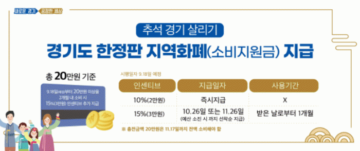 ÀÌ¿¡ µû¶ó °æ±âµµ´Â °æ±âÁö¿ªÈÆó ÃæÀü±Ý¾×ÀÇ 10%ÀÎ ±âº» Àμ¾Æ¼ºê¿¡ ´õÇØ ¿À´Â 9¿ù 18ÀÏ(¿¹Á¤)ºÎÅÍ ¼Òºñ±Ý¾× 20¸¸¿ø¿¡ ÇÑÁ¤ÇØ 15%¿¡ ÇØ´çÇÏ´Â 3¸¸¿øÀÇ ÇÑÁ¤ÆÇ Áö¿ªÈÆó¸¦ Ãß°¡ Áö±ÞÇÑ´Ù. Áï, 20¸¸¿øÀ» ÃæÀüÇÒ ¶§ »çÀüÀμ¾Æ¼ºê 2¸¸¿ø(10%)À» Áö¿øÇÏ´Â °Í¿¡ ´õÇØ, 2°³¿ù ³» 20¸¸¿ø »ç¿ë½Ã 3¸¸¿ø(15%)À» Áö¿øÇØ ÇÕ°è ÃÑ 25%, 5¸¸¿øÀ» Áö¿øÇÏ´Â °ÍÀÌ´Ù. 20¸¸¿ø ¹Ì¸¸ »ç¿ë½Ã¿¡´Â 15% Àμ¾Æ¼ºê°¡ ¾øÀ¸¸ç 20¸¸¿ø ÀÌ»óÀº ÃÖ´ë 3¸¸¿ø±îÁö¸¸ Áö¿ø¹ÞÀ» ¼ö ÀÖ´Ù.