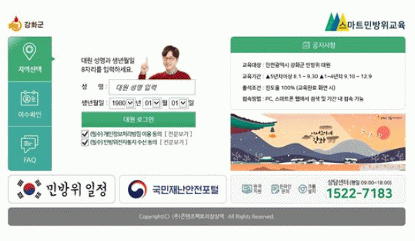 5³âÂ÷ ÀÌ»ó ´ë¿øÀº ÇϹݱ⠻çÀ̹ö±³À°ÀÌ ¿À´Â 9¿ù 30ÀϱîÁö ¿î¿µÇϸç, 1~4³âÂ÷ ¹Î¹æÀ§ ´ë¿ø ¹× ¹Î¹æÀ§´ëÀå »çÀ̹ö ±³À°Àº ¿À´Â 12¿ù 9ÀϱîÁö ¿î¿µµÈ´Ù. ±³À° ´ë»óÀÚ´Â PC³ª ½º¸¶Æ®ÆùÀ¸·Î °È±ºÃ» ȨÆäÀÌÁö(www.ganghwa.go.kr)³ª ÀÎÅÍ³Ý Æ÷Åп¡¼ ½º¸¶Æ® ¹Î¹æÀ§±³À° »çÀÌÆ®(www.cdec.kr)¿¡ Á¢¼ÓÇØ º»ÀÎ ÀÎÁõ ÈÄ ¾à 1½Ã°£ °úÁ¤ÀÇ ±³À°À» ¼ö°ÇÏ¸é µÈ´Ù.