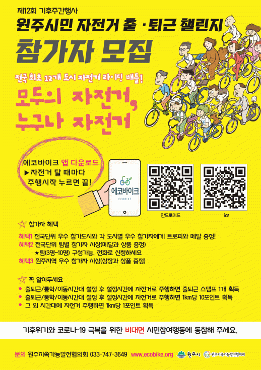 ÀÚÀü°Å ÃâÅð±Ù 縰Áö´Â Áö±¸ ¿Â³ÈÀÇ ¿øÀÎÀÎ ¿Â½Ç°¡½º °¨Ãà ¹× Äڷγª19 ´ëÀÀÀ» À§ÇØ ¿øÁÖ, ±¤ÁÖ, ´ë±¸, ´ëÀü, ¼ö¿ø, ÀüÁÖ µî 12°³ ÁöÀÚü¿Í Áö¼Ó°¡´É¹ßÀüÇùÀÇȸ°¡ ÁÖ°üÇϸç, Àü±¹ ÃÖÃÊÀÇ ÀÚÀü°Å ¶óÀ̵ù ¹èƲ ¹æ½ÄÀ¸·Î ¿î¿µµÈ´Ù.