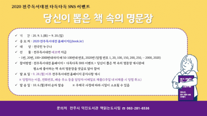 ÀÌ À̺¥Æ®´Â ÀüÁÖµ¶¼´ëÀü ȨÆäÀÌÁö(jjbook.kr)¿Í À¯Æ©ºê, ³×À̹öTV ä³ÎÀ» Ȱ¿ëÇØ ¡âÆ÷½ºÅÍ ¼Ó Àι°À» µû¶ó ÇØºÁ¿ä ¡â´ç½ÅÀÌ »ÌÀº Ã¥ ¼ÓÀÇ ¸í¹®Àå ¡â¿Â¶óÀÎ ´ñ±Û À̺¥Æ® µî 3°¡Áö·Î ÆîÃÄÁø´Ù.