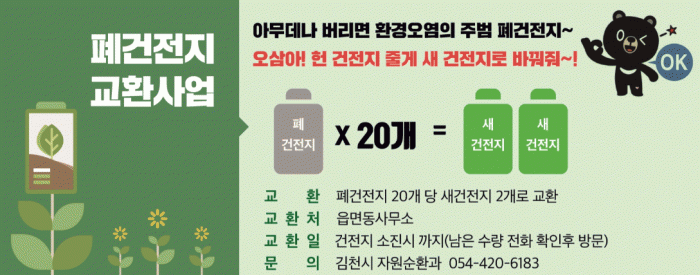 º» »ç¾÷Àº °¡Á¤¿¡¼ »ç¿ëÇÑ Æó°ÇÀüÁö 20°³¸¦ À¾¸éµ¿ Áֹμ¾ÅÍ¿¡¼ »õ°ÇÀüÁö(AA, AAA Áß ¼±ÅÃ) 2°³·Î ±³È¯ÇØ ÁÖ´Â »ç¾÷À¸·Î Æó°ÇÀüÁö´Â ¾ËÄ®¸®, ¸®Æ¬, ´ÏÄÌ, ¸Á°£ µî Á¾·ù »ó°ü¾øÀÌ ±³È¯°¡´ÉÇÏ¸ç ±èõ½Ã Àüü 10,000°³ ¹°·®À» ¼ÒÁø ½Ã±îÁö ÁøÇàÇÑ´Ù.