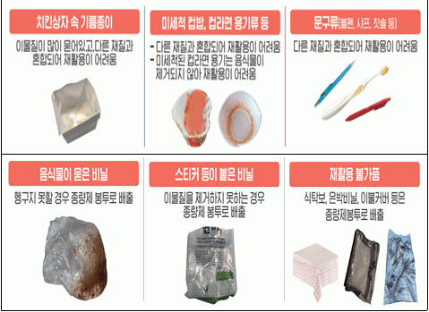 < ÀçȰ¿ëÀÌ ¾î·Á¿î ÇÃ¶ó½ºÆ½·ù ¿¹½Ã /> ġŲ»óÀÚ ¼Ó ±â¸§Á¾ÀÌ: À̹°ÁúÀÌ ¸¹ÀÌ ¹¯¾îÀÖ°í, ´Ù¸¥ ÀçÁú°ú È¥ÇյǾî ÀçȰ¿ëÀÌ ¾î·Á¿ò ¹Ì¼¼Ã´ ÄŹä, ÄŶó¸é ¿ë±â·ù µî: - ´Ù¸¥ ÀçÁú°ú È¥ÇյǾî ÀçȰ¿ëÀÌ ¾î·Á¿ò, - ¹Ì¼¼Ã´µÈ ÄŶó¸é ¿ë±â´Â À½½Ä¹°ÀÌ Á¦°ÅµÇÁö ¾Ê¾Æ ÀçȰ¿ëÀÌ ¾î·Á¿ò ¹®±¸·ù(º¼Ææ, »þÇÁ, Ä©¼Ö µî): ´Ù¸¥ ÀçÁú°ú È¥ÇյǾî ÀçȰ¿ëÀÌ ¾î·Á¿ò À½½Ä¹°ÀÌ ¹¯Àº ºñ´Ò: Çó±¸Áö ¸øÇÒ °æ¿ì Á¾·®Á¦ ºÀÅõ·Î ¹èÃâ ½ºÆ¼Ä¿ µîÀÌ ºÙÀº ºñ´Ò: À̹°ÁúÀ» Á¦°ÅÇÏÁö ¸øÇÏ´Â °æ¿ì Á¾·®Á¦ ºÀÅõ·Î ¹èÃâ ÀçȰ¿ë ºÒ°¡Ç°: ½ÄŹº¸, Àº¹Úºñ´Ò, À̺ÒÄ¿¹ö µîÀº Á¾·®Á¦ºÀÅõ·Î ¹èÃâ