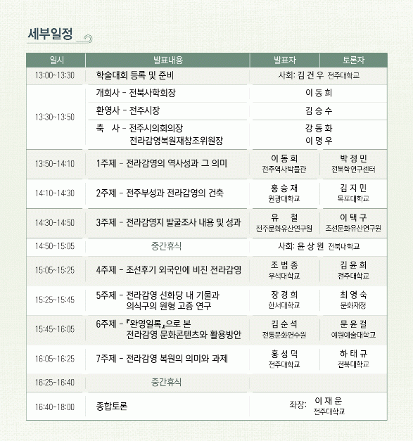 ÀüÁÖ½Ã¿Í ÀüºÏ»çÇÐȸ(ȸÀå À̵¿Èñ)´Â 11ÀÏ Àü¶ó°¨¿µ ¼±È­´ç¿¡¼­ Àü¶ó°¨¿µ º¹¿øÀ» ±â³äÇϰí Àü¶ó°¨¿µ º¹¿øÀÇ ÀÇ¹Ì¿Í ¼º°ú µîÀ» ³íÀÇÇÏ´Â ¡®Àü¶ó°¨¿µ º¹¿ø±â³ä Çмú´ëȸ¡¯¸¦ °³ÃÖÇß´Ù. Àü¶ó°¨¿µÀº ¿À´Ã³¯ÀÇ ÀüºÏ°ú Àü³², Á¦ÁÖ¸¦ °üÇÒÇß´ø Àü¶óµµ ÃÖ°íÀÇ Áö¹æÇàÁ¤ÅëÄ¡±â±¸·Î, µ¿Æí Àü¶ó°¨»ç ¿µ¿ª º¹¿øÀ» ¸¶Ä¡°í Áذø½ÄÀ» ¾ÕµÎ°í ÀÖ´Ù.