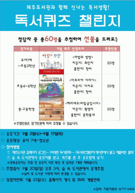 '9¿ù µ¶¼ÀÇ ´Þ¡¯À» ¸ÂÀÌÇÏ¿© ¡®³» ÀλýÀÇ Ã¥ ÇÑ ±Ç: ¼·Î ¼·Î µ¶¼·Î¡¯¸¦ ¿î¿µÇϰí ÀÖ´Ù. ¾î¸°ÀÌ, û¼Ò³â ¹× ¼ºÀÎ ´©±¸³ª °¨¸í ±í°Ô ÀÐÀº Ã¥¿¡ ´ëÇÑ ´À³¦±ÛÀ̳ª Ãßõ±ÛÀ» ÀÀ¸ðÇÏ¸é ¿ì¼öÀÛ ¼±Á¤ ÈÄ È¨ÆäÀÌÁö¿¡ Àü½ÃÇÏ°í ¼ÒÁ¤ÀÇ ±â³äǰÀ» Á¦°øÇÒ ¿¹Á¤ÀÌ´Ù. 9¿ù 1ÀÏ(È)~29(È)±îÁö Á¦ÁÖµµ¼°ü ȨÆäÀÌÁö¿¡¼ Âü¿© °¡´ÉÇÏ´Ù.