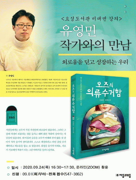 9¿ù 24ÀÏ, °è¾ç±¸ ¿ÃÇØÀÇ Ã¥ ¼±Á¤µµ¼ <¿ÀÁîÀÇ ÀÇ·ù¼ö°ÅÇÔ> À¯¿µ¹Î ÀÛ°¡¿ÍÀÇ ¸¸³²Àº »çÀü Á¢¼ö¸¦ ÅëÇØ ¿Â¶óÀÎÀ¸·Î ÁøÇàÇÏ°í ¿ì¸®°¡ °¡Áø ¿Ü·Î¿ò, Ä¡À¯¿¡ °üÇÑ À̾߱â¿Í ¿Ã¹Ù¸¥ µ¶¼¹ý°ú ±Û¾²±â ¹æ¹ýÀº ¹«¾ùÀÎÁö ´ëÇØ ¾Ë¾Æº¸´Â ½Ã°£À» °¡Áø´Ù.
