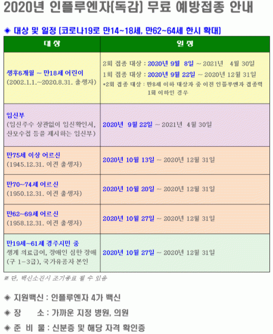 ¹«·áÁ¢Á¾ ´ë»óÀÚ´Â »ýÈÄ 6°³¿ù~¸¸18¼¼, ÀӽźÎ, ¸¸62¼¼ ÀÌ»ó ½Ã¹ÎÀÌ´Ù. Äڷγª19¿Í µ¶°¨ÀÇ µ¿½Ã À¯ÇàÀ» ´ëºñÇϱâ À§ÇÑ ÇѽÃÀû Á¶Ä¡·Î ¸¸14~18¼¼ ¹× ¸¸62~64¼¼°¡ ´ë»óÀÚ·Î Æ÷ÇԵƴÙ.