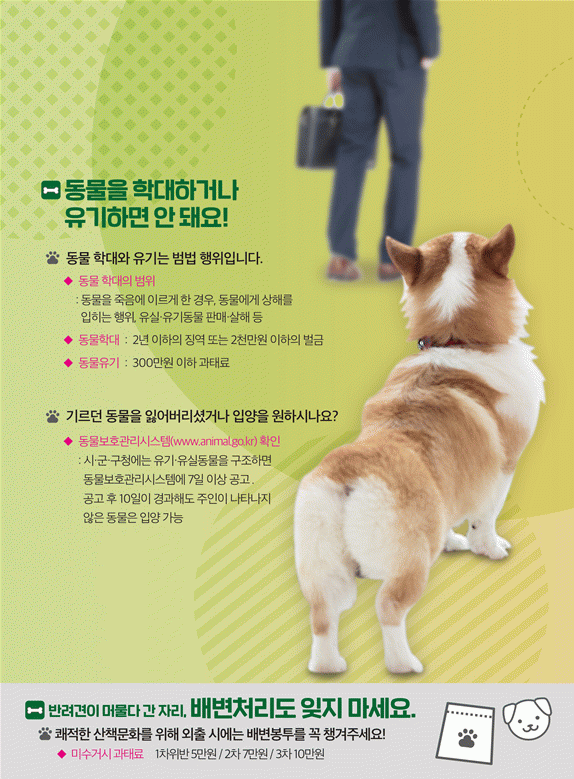 ÇÑÆí, µ¿¹°º¸È£¹ý¿¡ µû¶ó µ¿¹° À¯±â¤ýÀ¯½Ç ¹æÁö¸¦ À§ÇØ 2°³¿ù·É ÀÌ»óÀÇ °³¿¡ ´ëÇÏ¿© µ¿¹°µî·ÏÀ» Àǹ«ÈÇϰí ÀÖÀ¸¸ç, À§¹Ý½Ã °úÅ·ᰡ ºÎ°úµÈ´Ù.