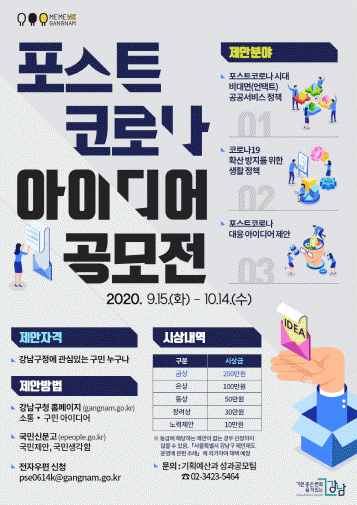 °³²±¸¹ÎÀÌ¸é ´©±¸³ª Âü¿©ÇÒ ¼ö ÀÖÀ¸¸ç, ±¸ ȨÆäÀÌÁö(gangnam.go.kr) ¶Ç´Â ±¹¹Î½Å¹®°í(epeople.go.kr)¸¦ ÅëÇØ Á¢¼öÇÒ ¼ö ÀÖ´Ù. ÀÚ¼¼ÇÑ »çÇ×Àº ±âȹ¿¹»ê°ú(¢Ï02-3423-5464)·Î ¹®ÀÇÇÏ¸é µÈ´Ù. »ó±ÝÀº ¡â±Ý»ó(200¸¸¿ø) ¡âÀº»ó(100¸¸¿ø) ¡âµ¿»ó(50¸¸¿ø) ¡âÀå·Á»ó(30¸¸¿ø) ¡â³ë·ÂÁ¦¾È(10¸¸¿ø)À» ¼±Á¤ÇØ 10¿ù Áß ¹ßÇ¥ÇØ ½Ã»óÇÑ´Ù.