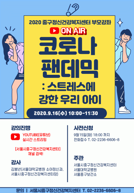 ±³À°Àº Äڷγª19·Î Áö¿ª»çȸ È®»ê ¹æÁö¸¦ À§ÇØ ¿Â¶óÀÎ À¯Æ©ºê¸¦ ÅëÇØ ½Ç½Ã°£ ¹æ¼ÛµÇ¸ç, ¿À´Â 16ÀÏ ¼ö¿äÀÏ ¿ÀÀü 10½ÃºÎÅÍ '¼¿ï½ÃÁß±¸Á¤½Å°Ç°º¹Áö¼¾ÅÍ' À¯Æ©ºê ä³Î¿¡¼ ½ÃûÇÒ ¼ö ÀÖ´Ù. °ü½É ÀÖ´Â Áß±¸¹ÎÀ̶ó¸é ´©±¸µçÁö Âü¿© °¡´ÉÇÏ´Ù.