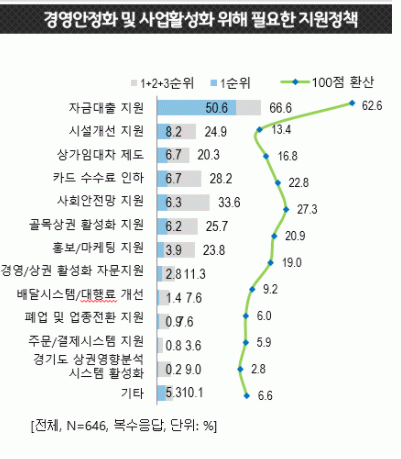 ÇâÈÄ °æ¿µ¾ÈÁ¤À» À§ÇØ °¡Àå ÇÊ¿äÇÑ Áö¿øÁ¤Ã¥À¸·Î´Â ¡®ÀڱݴëÃâ Áö¿ø¡¯ÀÌ 50.6%·Î °ú¹ÝÀ» Â÷ÁöÇß´Ù. À̿ܿ¡µµ ½Ã¼³°³¼±(8.2%), »ó°¡ÀÓ´ëÂ÷Á¦µµ °³¼±(6.7%), Ä«µå¼ö¼ö·á Áö¿ø(6.7%) µîÀÌ ÇÊ¿äÇÏ´Ù°í ÀÀ´äÇß´Ù.