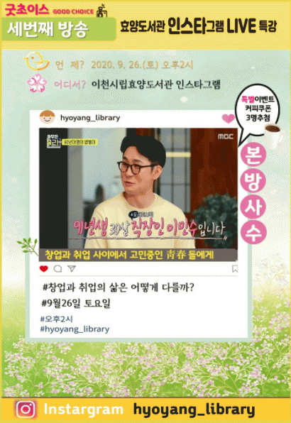 °ÀÇ´Â 9¿ù26ÀÏ ¿ÀÈÄ2½Ã È¿¾çµµ¼°ü ÀνºÅ¸±×·¥(°èÁ¤¸í:hyoyang_library)¶óÀÌºê ¹æ¼ÛÀ¸·Î ÁøÇàÇÑ´Ù.