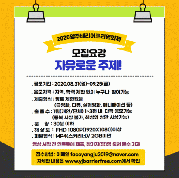 °ø¸ð´Â ¿µÈÁ¦ ȨÆäÀÌÁö(www.barrierfree.modoo.at)¿¡¼ ½Åû¼¸¦ ³»·Á¹Þ¾Æ ÀÛǰ ÆÄÀϰú ÇÔ²² ¿µÈÁ¦ »ç¹«±¹ À̸ÞÀÏ(facoyangju2019@naver.com)·Î Á¢¼öÇÏ¸é µÈ´Ù.