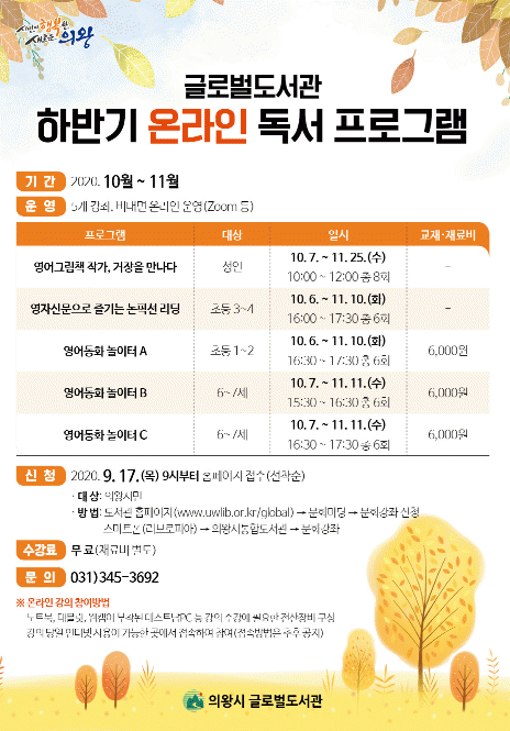 °¢ ÇÁ·Î±×·¥º° »ó¼¼ÀÏÁ¤°ú ³»¿ëÀº Àǿսà ±Û·Î¹úµµ¼°ü ȨÆäÀÌÁö¿¡¼ È®ÀÎÇÒ ¼ö ÀÖÀ¸¸ç, ¹®ÀÇ»çÇ×Àº ±Û·Î¹ú µµ¼°ü(031-345-3692)À¸·Î ¿¬¶ôÇÏ¸é µÈ´Ù.
