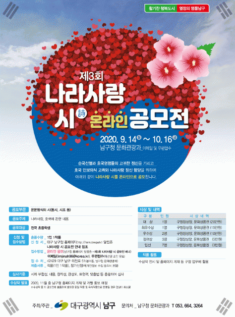 ¡°³ª¶ó»ç¶û, È£±¹¿¡ °üÇÑ ³»¿ë¡±À» ÁÖÁ¦·Î ÇÏ¿© ¿î¹® Çü½Ä(µ¿½Ã, ½ÃÁ¶ µî)À¸·Î ÀÚÀ¯·Ó°Ô ÀÛ¼º, 1ÀÎ 1ÀÛǰÀ» ³²±¸Ã»¿¡ Á¦ÃâÇÏ¸é µÈ´Ù.