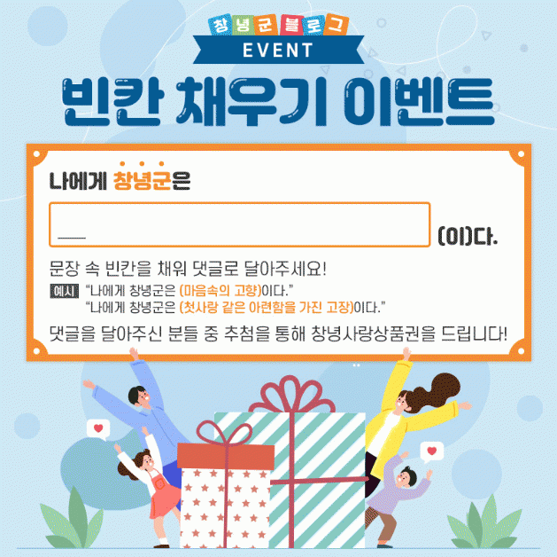 À̺¥Æ®´Â 18ÀϺÎÅÍ 27ÀϱîÁö 10Àϰ£ ½Ç½ÃµÇ¸ç, Àü ±¹¹Î ´©±¸³ª â³ç±º ºí·Î±× À̺¥Æ® °Ô½Ã±Û¿¡ ¡°³ª¿¡°Ô â³ç±ºÀº ( ) ÀÌ´Ù.¡±¼Ó ºóÄÀ» ä¿ö ¿Ï¼ºµÈ ¹®ÀåÀ» ´ñ±Û·Î ´Þ¸é µÈ´Ù.